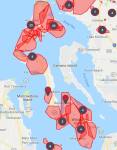 Watch the power go out nearly simultaneously – then slowly come back on. Puget Sound Energy (PSE) has a handy outage map that lets people drill into their outage to get estimates for recovery. It’s also handy for seeing the extent of the outage. When it is only a few folks, power may come back quickly. When great swathes of red carpet the map, it becomes a guessing game, but also a signal to fire up the woodstove, tape the fridge shut, and decide how much time you want to spend with friends, books, and bottles of wine. Those numbers in circles can hide bigger issues. One way to think of them is as the number of neighboring neighborhoods that are out. Those big white gaps are usually where the power is on, but in this storm, they were hints that the winds had hit there so hard that people couldn’t even report their outages. (The images span irregular intervals over roughly four days.)