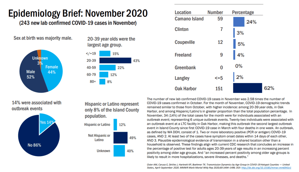 Within the county, the biggest population center and the place with the greatest population density remains the place with the highest incidence of infections (62%). Not a surprise. The fact that may be a surprise is that young people (20-39 years old) are the most likely to be infected (43%). The two statistics may simply reflect the demographics that Oak Harbor has the lowest median age in the county.
