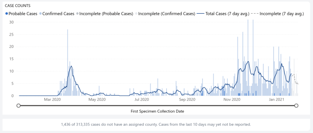 Let’s deal with the bad news first. The spike that happened over the holidays was worse than the initial spike. There was a bit of good news in there, too. The worries about the tourist season are seen to be very small in comparison to whatever caused the surge in cases over the holidays. Perhaps the first spike caught us by surprise and before we knew what to do. Perhaps the tourist season was busy, but many of them stayed in the places they rented. Perhaps pandemic fatigue or traditional socializing or whatever caused the holiday spike.