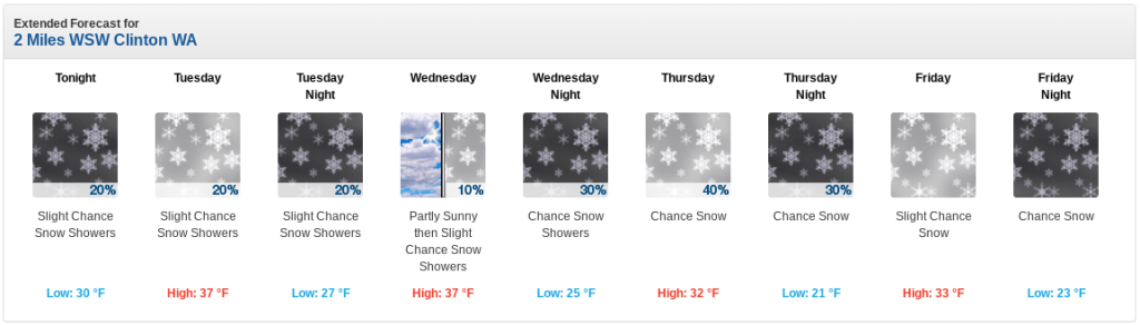 Whidbey Island has so many climates that one number does not suffice. Close to the water usually means slightly warmer. Higher is colder. North is closer to where those cold mountain winds swing in. South is closer to where the convergence zone forms. Good luck with that forecast, especially because the news stations are covering hundreds of miles, dozens of islands, and two mountain ranges.