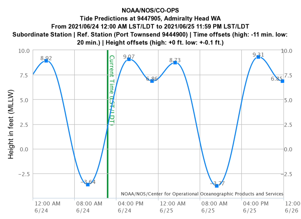 Also around noon the temperatures rise; but they don’t peak until a few hours later. This year comes with a temperature alert. Some places over the next few days are expected to reach records. Over the next few days parts of the region will be under Excessive Heat Watches. Surprisingly to some, that’s true for Seattle, but not for Whidbey. Islands in the Salish Sea are surrounded by natural air conditioners. The air may be in the 80s or 90s, but the water is resolutely near 50F. Plunge your toes in that! That also means the mainland can be 10F degrees hotter, or from a different perspective, the islands can be 10F cooler. Closer to the water is best. Get far enough inland and the heat returns.
