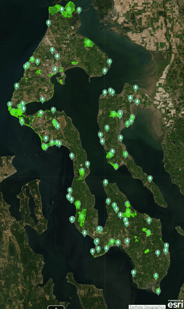 The County has a map. From the more federally-protected Ebey’s Landing to State parks like Deception Pass to South Whidbey to Possession Point, with County parks and city parks, there’s a lot to pick from.