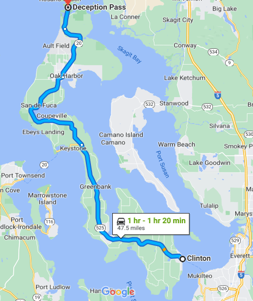 Whidbey is a long island, but the main portals are the bridge and the two ferries. The longest drive between portals is from the Pass to the Clinton ferry. It isn’t the longest drive; that would mean driving to the end of Franklin Road and Possession Point State Park. According to the mapping sites, the drive is almost exactly one hour (1 hour 2 minutes). Considering the price of gas the mileage may be more important (47.5 miles). Check your mileage and the price of gas at your normal supplier. There and back can cost about the same as a reasonable lunch. Your gas mileage, driving style, and culinary tastes may vary.
