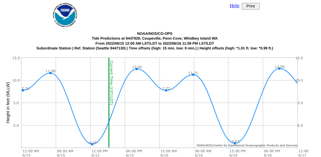 Whidbey’s tides vary even more because: 1) Whidbey is ~55 miles from tip to tip – by air, and 2) Whidbey’s bars, harbors, coves, and inlets contort the picture as the shoreline and the shape of the sea floor means different places fill and empty at different rates. Tides on the west side are different than tides on the east side because of Deception Pass, a more convoluted coast line, and which way to water flows as the tides are split as they work their way around the southern tip of the island. The distance from Admiralty Head (at the Coupeville Ferry terminal) to Penn Cove (and downtown Coupeville) is less than five miles, but the tides are deeper and later in Penn Cove – at least for June 15, 2022.