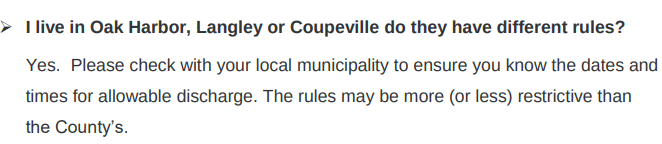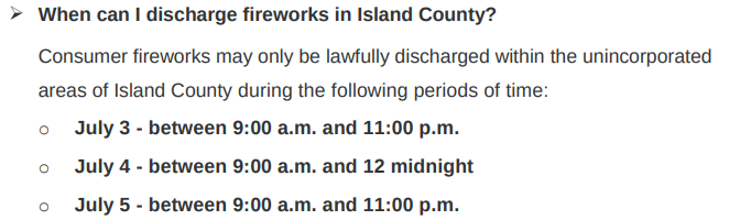 This is also a good time to remember when, where, and how fireworks can be fired off. Some places, not at all. (A good reason to take your pets there?) Here’s a link to Island County’s Fireworks FAQs (pdf), as well as a few snippets from the document.