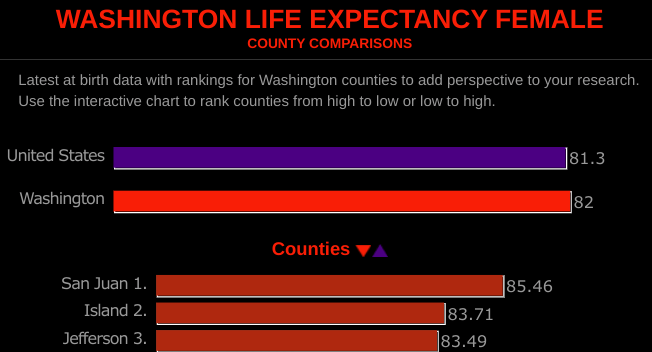 Within Washington State, Island County is the best, or San Juan County is the best. There’s some disagreement. The two of us are 1 & 2 in either case. (The study saying Island County is best dropped behind a paywall.) Island County female life expectancy 83.71 / male life expectancy 80.14 versus San Juan County female life expectancy 85.46 / male life expectancy 81.86 years (BTW One of our neighboring counties, Jefferson where Port Townsend is, is number 3. We’re a nice corner of the state.)