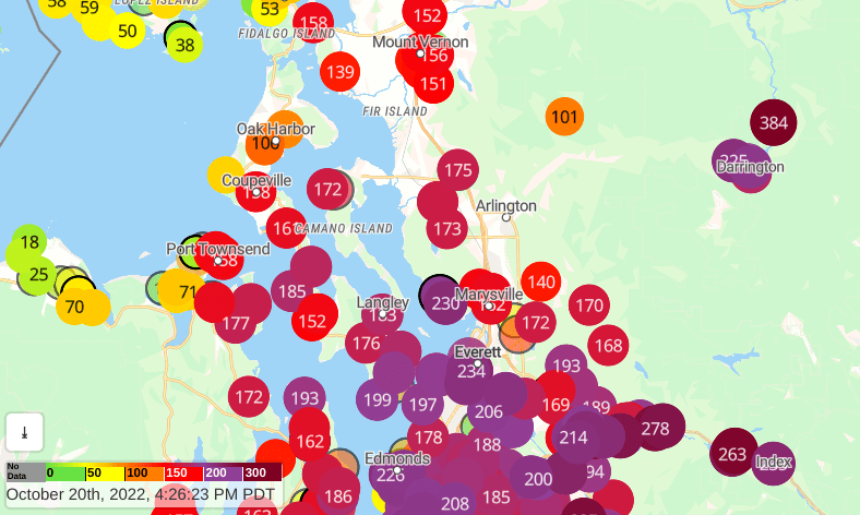 From June 21 until October 21 there was less than an inch of rain in the area. (Tidbits October 1 2022) Lawns turned from green to brown to grey to dust – except perhaps over septic fields or where people watered the grass. That dryness is why forest fires started in the temperate rain forests fifty miles east of the island. Winds that normally blow west to east decided to blow east to west and the region had some of the worst air in the world. Cars accumulated ash as well as dust.